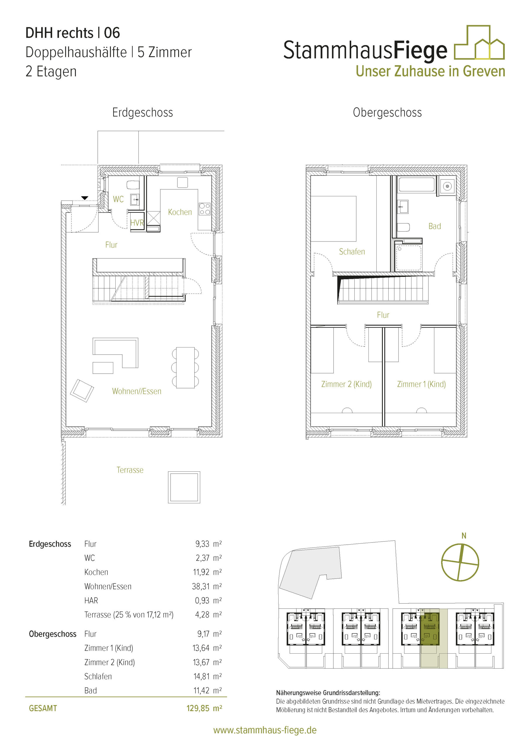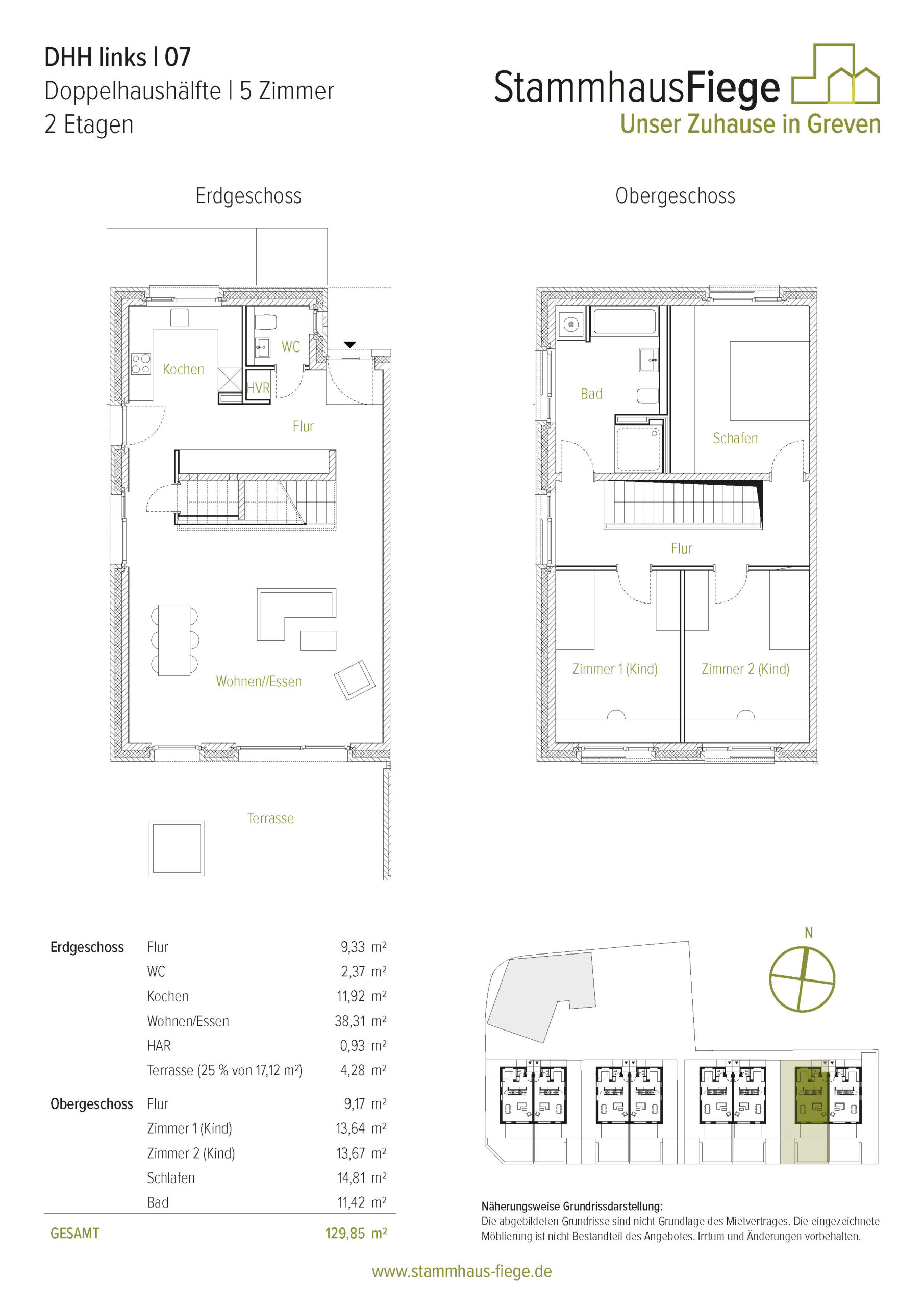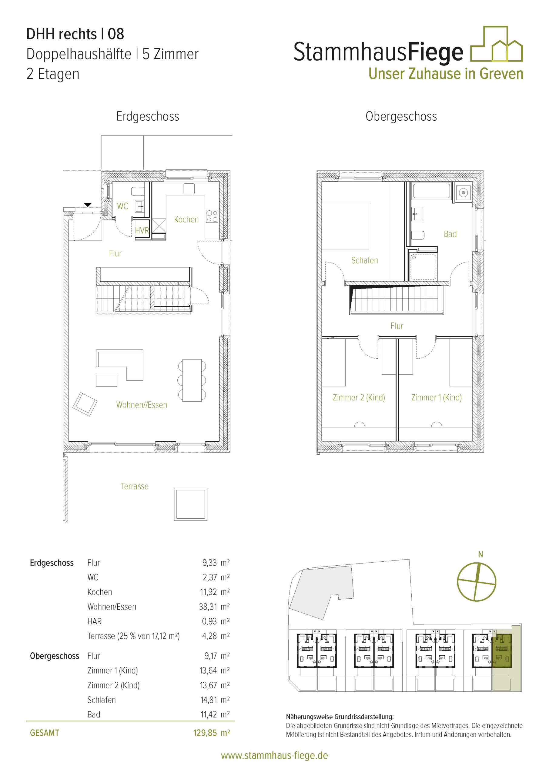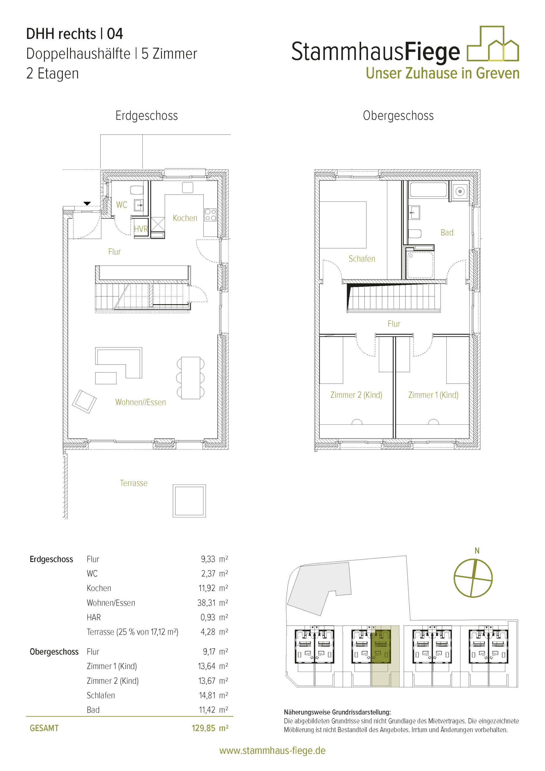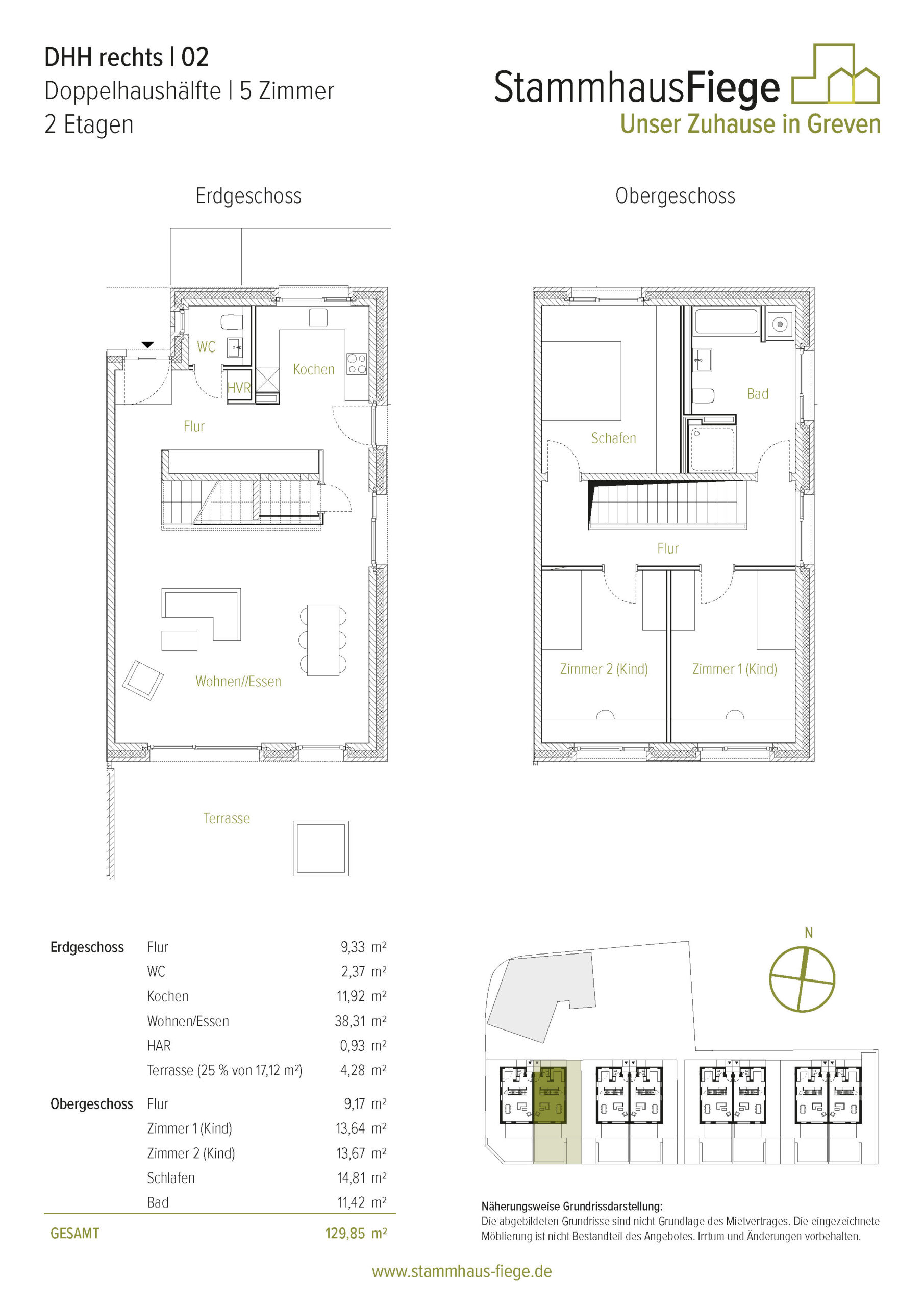 Die spiegelgleichen Doppelhäuser haben eine Wohnfläche von knapp unter 130m², verteilt auf zwei Ebenen. Im Erdgeschoss findet man ausreichend Platz zum Wohnen, Leben, Kochen und Essen. Hier befinden sich auch ein Gäste-WC und Abstellflächen. Im Obergeschoß gibt es neben einem lichtdurchfluteten Bad drei geräumige Zimmer zum Arbeiten, Schlafen, für’s Hobby und/oder für den Nachwuchs. In den Gärten der Doppelhaushälften lassen die Hochbeete neben den gepflanzten, alten Obstbäumen Freiraum für eigene Ideen.